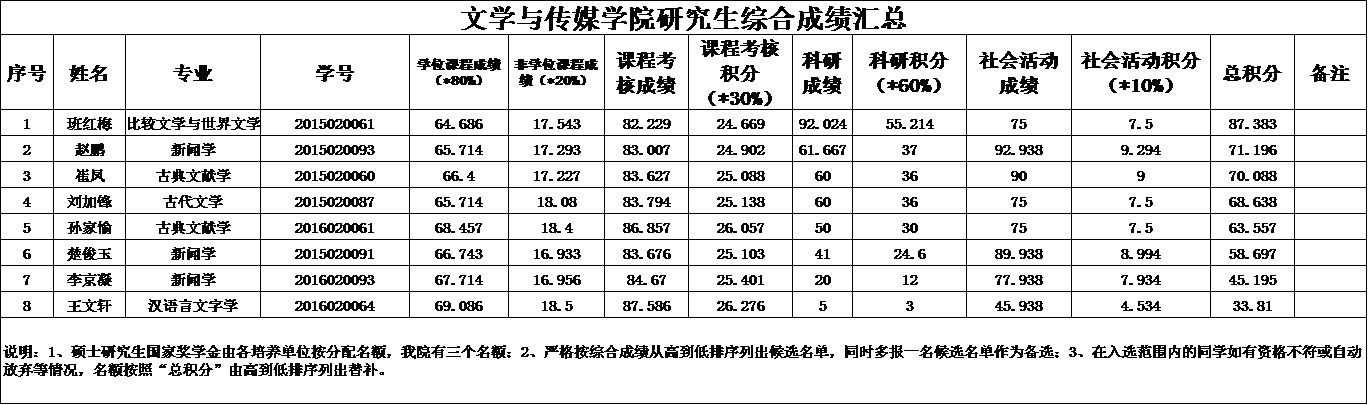 按照学校《关于做好2016-2017学年度研究生国家奖学金评审工作的通知》要求,结合文学与传媒学院实际情况,在学院充分广泛宣传发动、研究生本人自主申报的基础上,经学院研究生评优评奖评审领导小组会议和学院党政联席会认真研究,按照《贵州大学文学与传媒学院研究生国家奖学金评定实施细则》的要求评审,拟推荐以下同学参加2016-2017学年贵州大学国家奖学金(研究生)的评选,现予以公示。