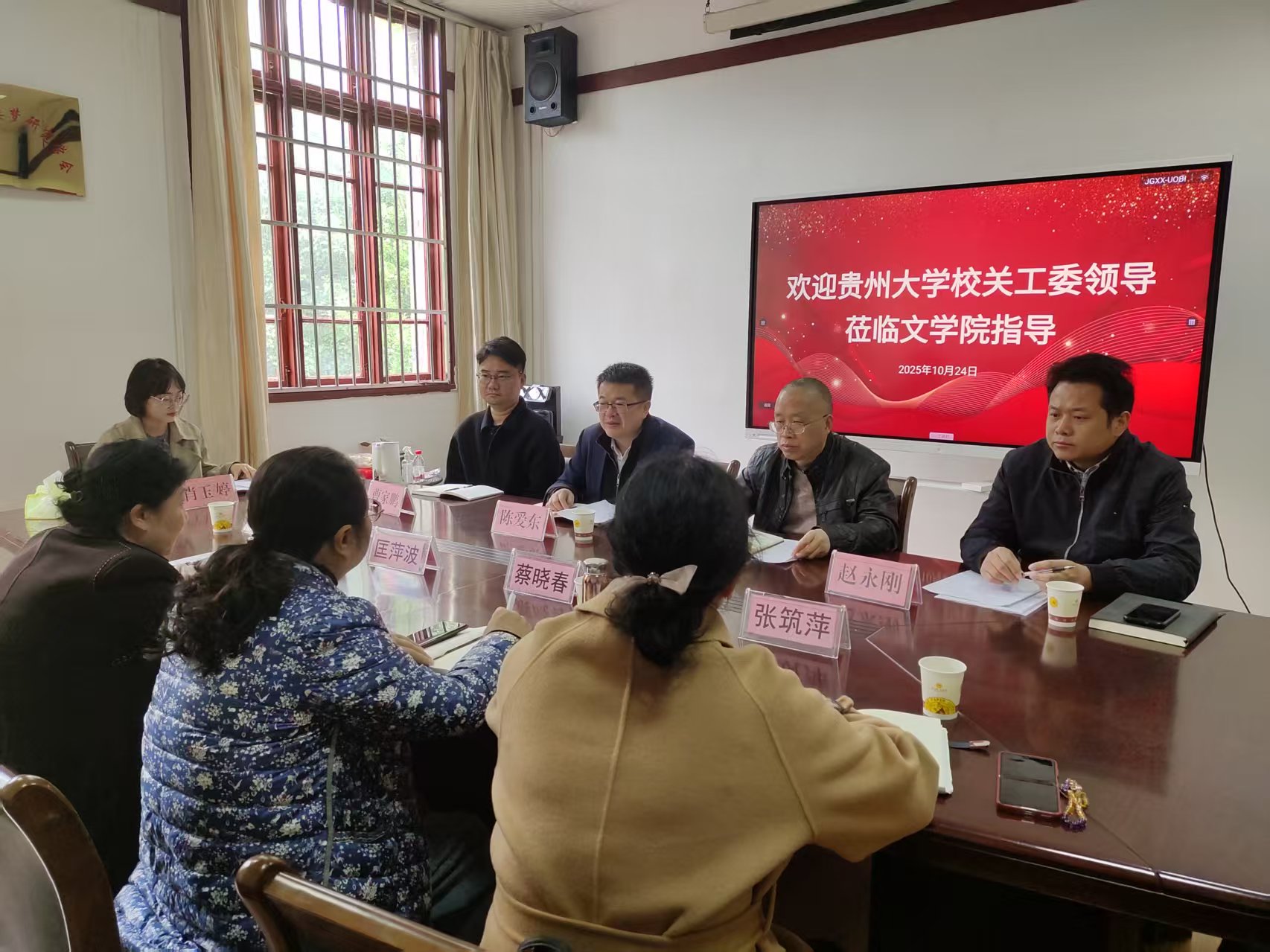 10月24日上午,贵州大学关工委领导匡萍波、刘艳、蔡晓春、张筑萍老师到mk官网入口指导工作。会议在人文楼304mk官网入口关工委办公室举行,学院党委书记陈爱东、院长谭德兴、mk官网入口关工委主任赵永刚、学生科副科长曹家鹏、党政办公室副主任肖玉婷参加会议。