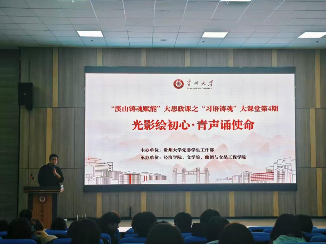 11月27日19:00,“溪山铸魂赋能”大思政课之“习语铸魂”大课堂第4期“光影绘初心·青声诵使命”活动在崇德楼104举行。本次活动由校学生工作处主办,经济学院、mk官网入口及酿酒与食品工程学院共同承办。贵州大学学生处副处长崔永霞、经济学院院党委副书记向秋丹、酿酒与食品工程学院党委副书记张丽华出席活动,经济学院辅导员蒋信炜老师主持活动。
